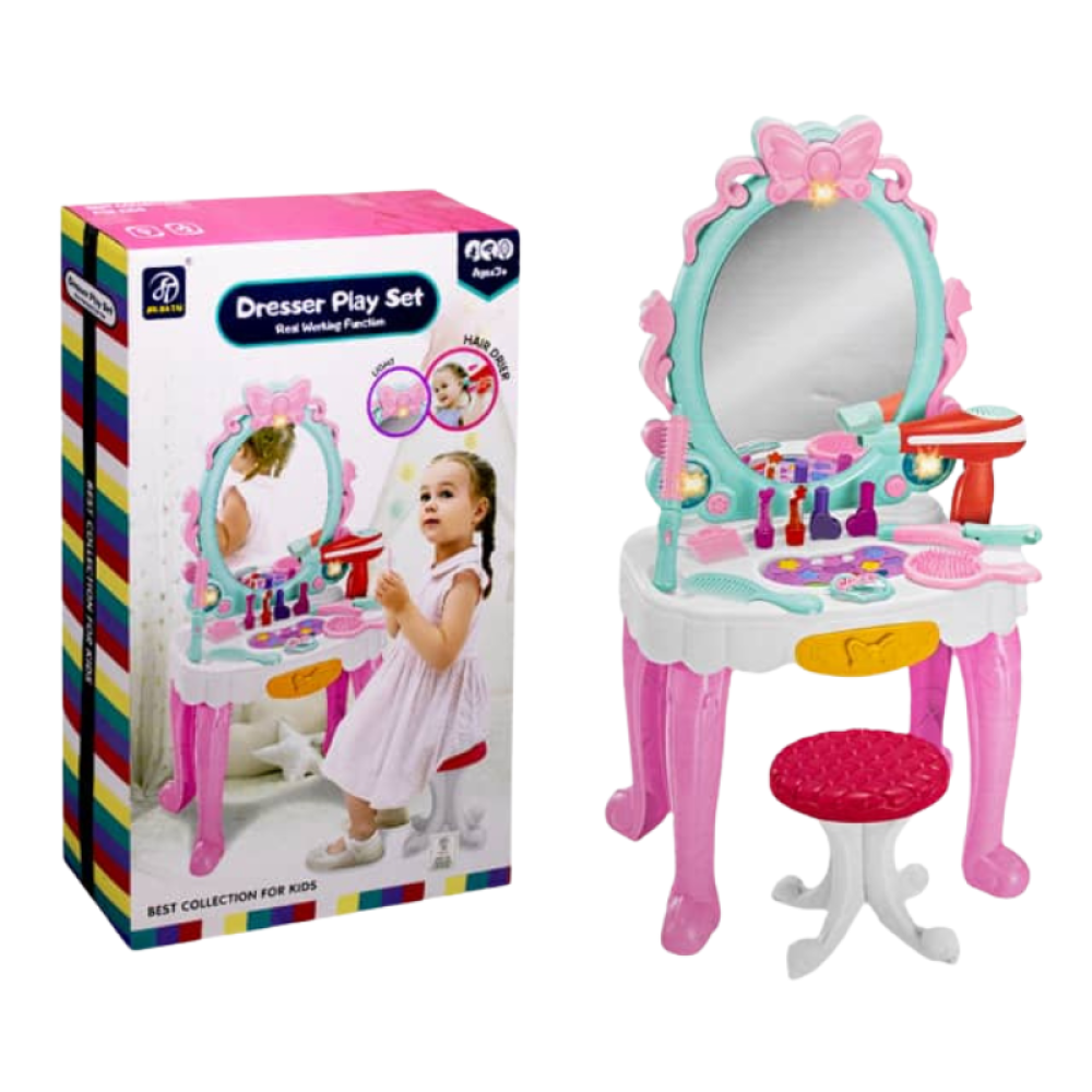 خلي أميرتك تتزين وتعيش أجواء الأناقة مع طقم تسريحة "دلع البنوتة" 💅! تصميم بناتي لطيف مع مرآة كبيرة وإضاءة ولمسة فراشية جميلة 🎀. تحتوي على أدوات مكياج بلاستيكية آمنة وفرش وأدوات شعر عشان تعيش الدور بكل تفاصيله 💖.