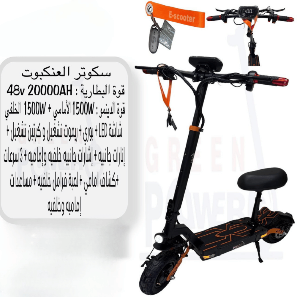استمتع بتجربة قيادة ممتعة وآمنة مع سكوتر العنكبوت الكهربائي 3000 واط! 🛴 هذا السكوتر يتميز بمحرك قوي وخصائص متطورة مثل الإضاءة الخلفية، شاشة LED، وأربع سرعات مختلفة. بفضل مساعدات أمامية وخلفية، يوفر لك سكوتر العنكبوت راحة قيادة استثنائية سواء على الطرق المستوية أو الوعرة. ⚡
