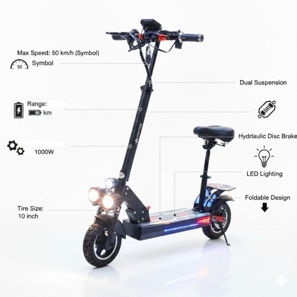 • قوة جبارة وأداء خرافي: يجي بمحرك 1000 واط 💪، يعني قوة وعزم ما شاء الله، يخلي صعود المرتفعات سهل وممتع، مهوب سكوتر، هذا صاروخ متنقّل! 🚀