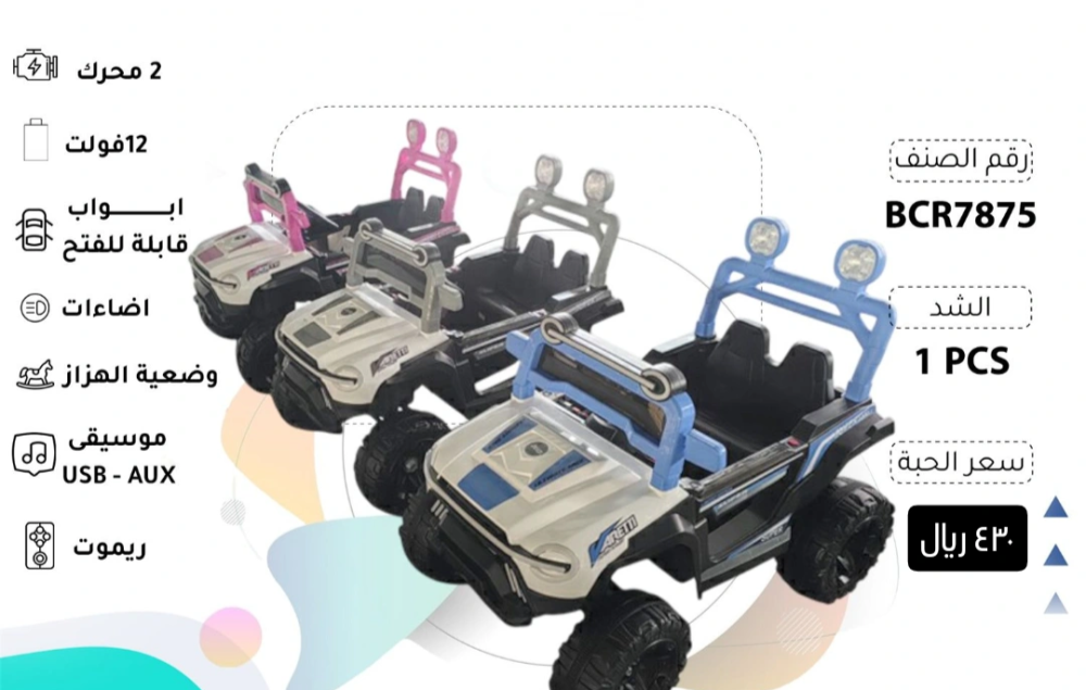 مواصفات سيارة جيب أطفال وردي ماطورين 12 فولت:
